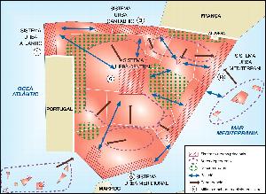 Mapa vectorial editable, corema, de los sistemas urbanos de España